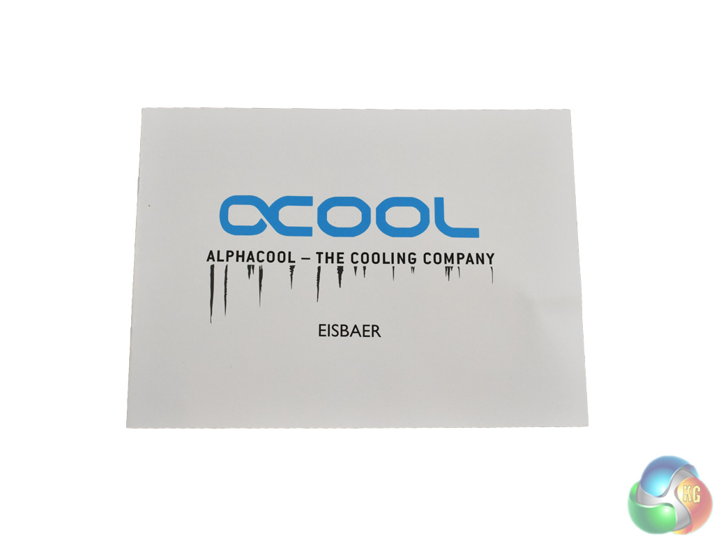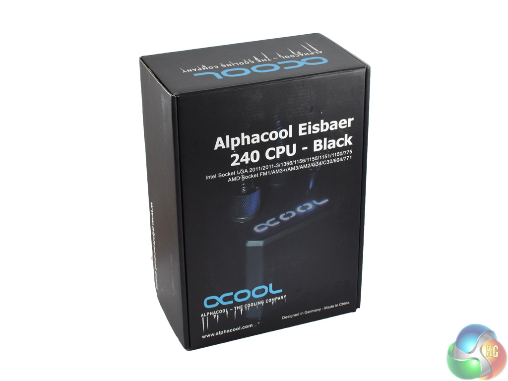 The Alphacool Eisbaer 240 ships in a sleek black box, with a picture of the pump on the front.