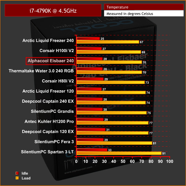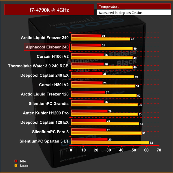 As you can see, performance from the Eisbaer is certainly very good. At stock clocks, it is joint second for cooling performance. When the CPU is overclocked, it shares third place in our chart with the Thermaltake Water 3.0 240 RGB.