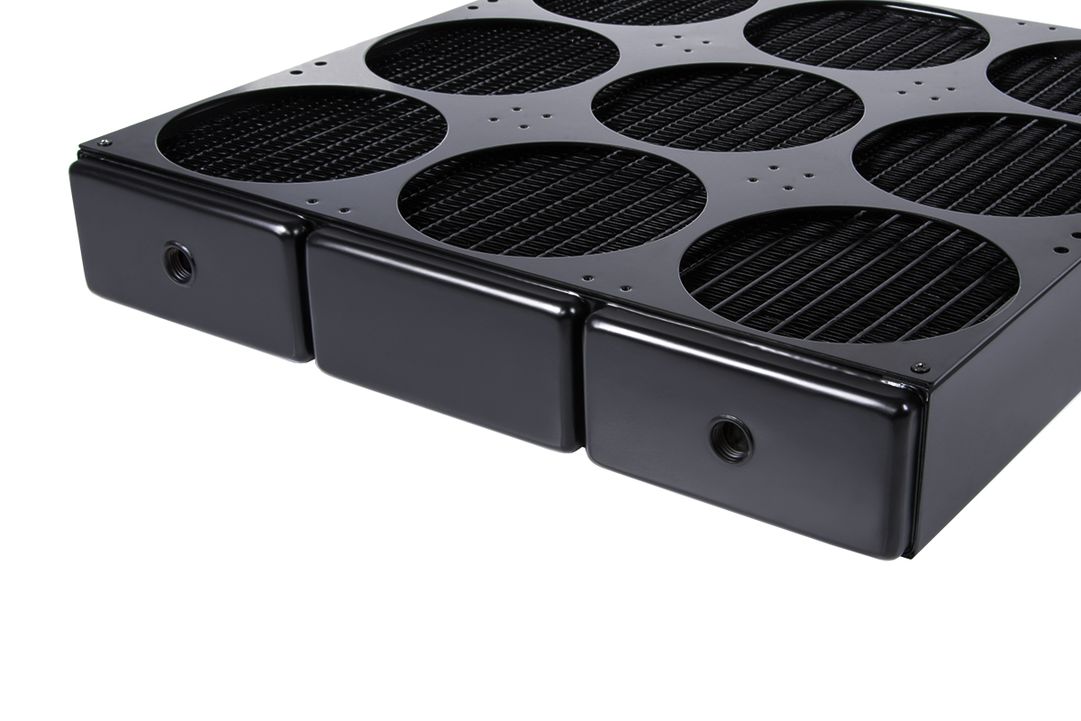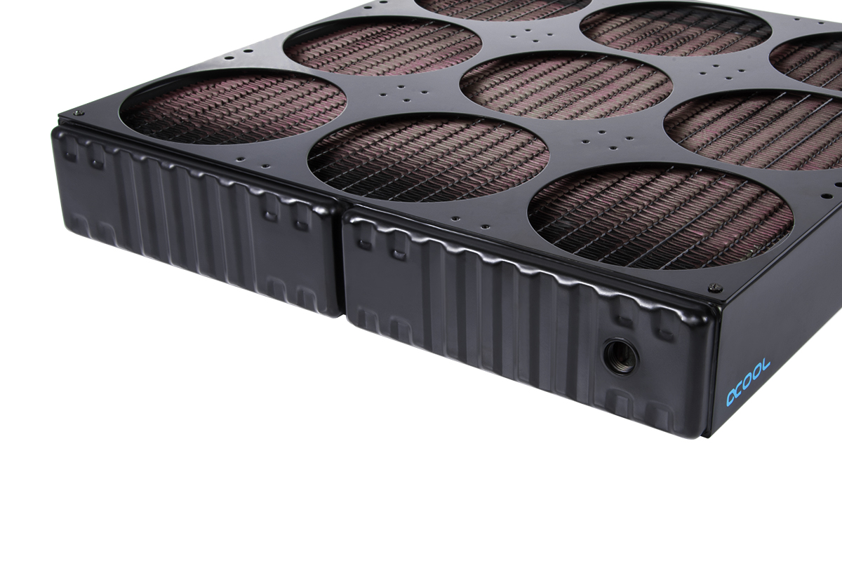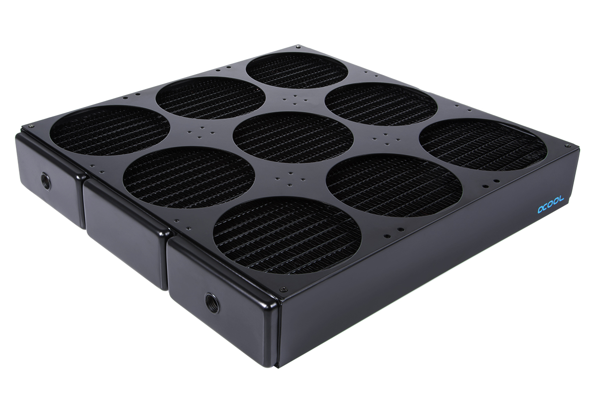 Starting with the NexXos 1080 Nova, the name is derived from its support for 9x 120mm fans, totalling 1080mm. Alphacool reckons the overall cooling is comparable to 3x 360mm radiators that are each 60mm thick. It's ability to cool over 1000W would be enough for three RTX 3090s or three AMD Threadripper 3990X CPUs.