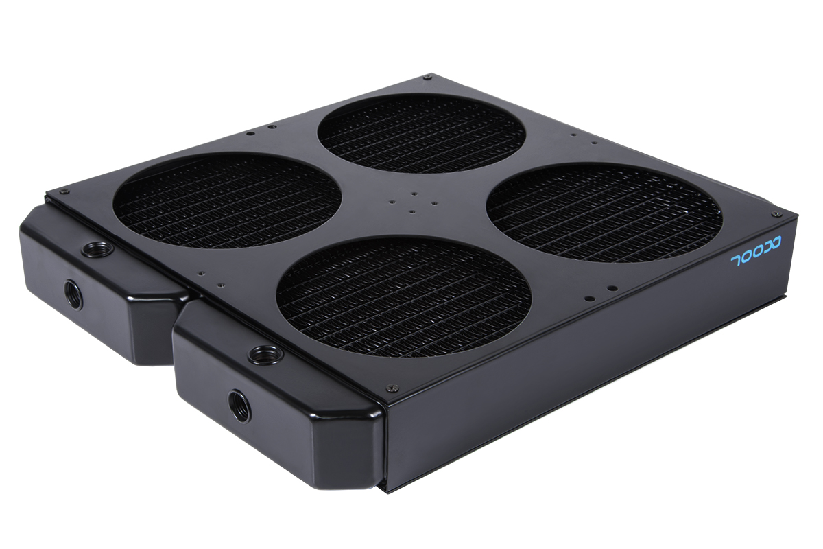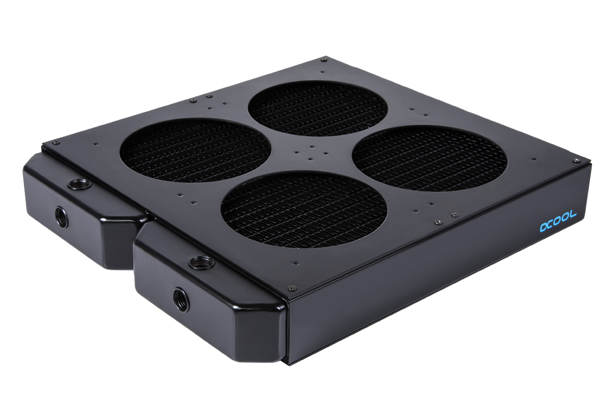 Finally we have the NexXxoS XT45, which Alphacool somewhat amusingly describes as ‘the little sibling of the Nova' series. It's hardly little, as it can support 4x 120mm or 140mm fans, and boasts total cooling capacity that is equivalent to a single 560mm radiator. Just like the Monsta radiators, it also boasts a total of seven G1/4″ ports, while it weighs 2370g. Measurements are listed at 32.2 x 28 x 4.9 cm.