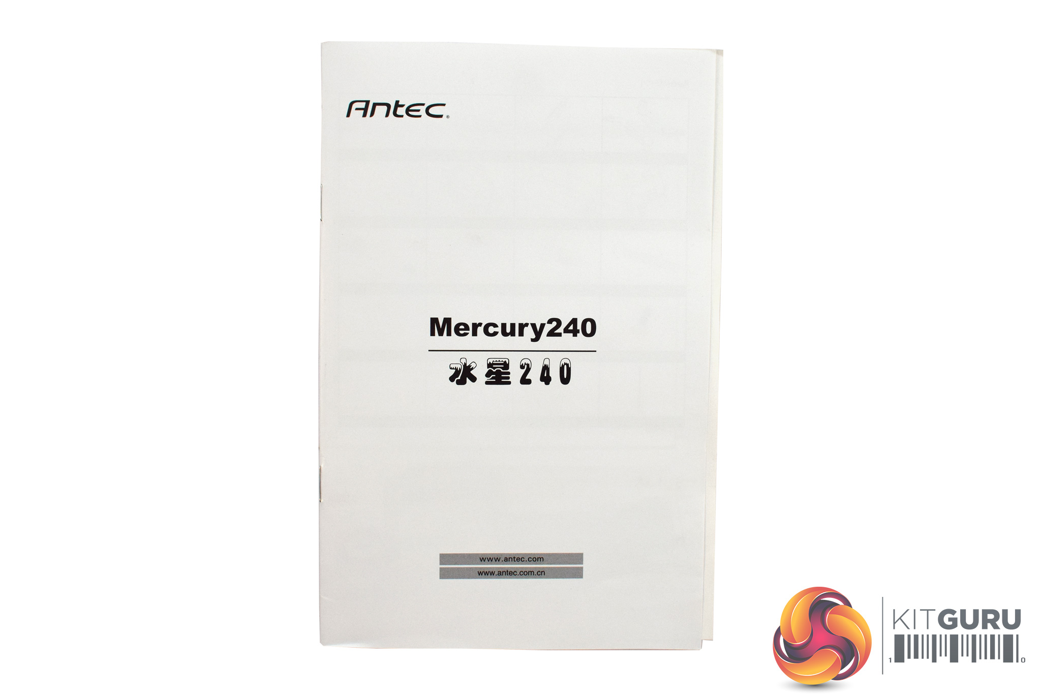 The Antec Mercury 240 ships in a dark box with blue and white accents, along with a photo of the cooler on the front.