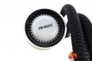 The pump/waterblock is quite hefty and features a relatively innocuous Antec logo in the middle. The white top-plate is where the temperature-reactive LED will shine through.