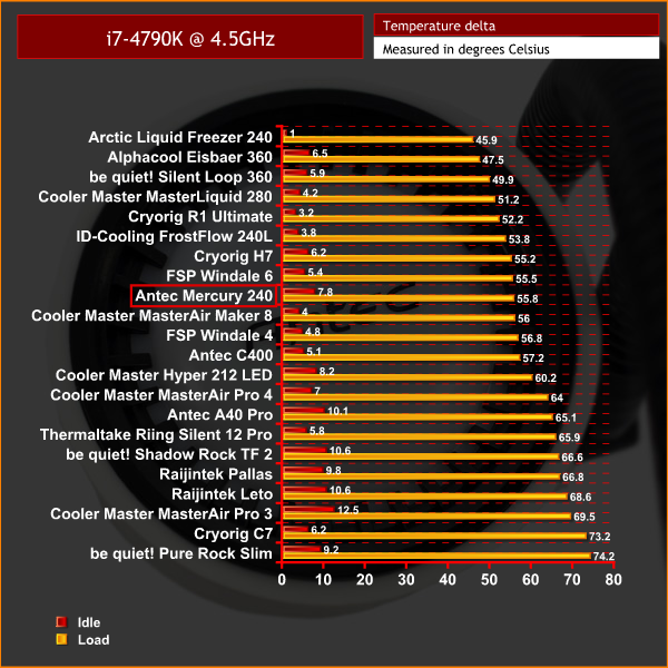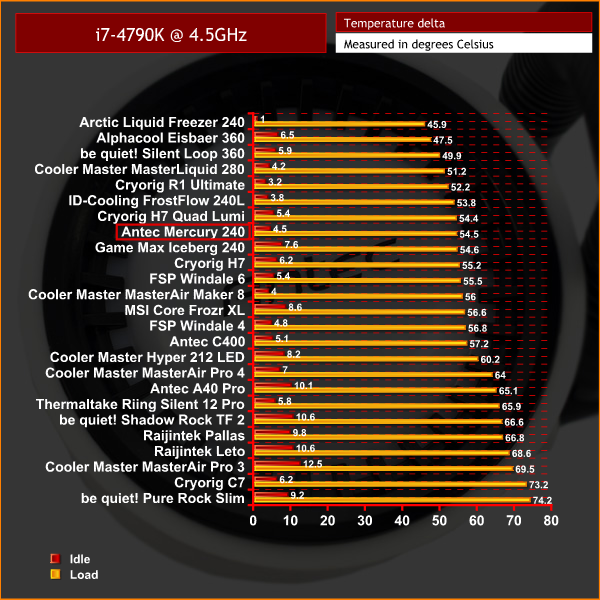 As you can see, across both tests, the Mercury 240's performance is a bit disappointing. I re-mounted and re-ran my tests to confirm the accuracy of the figures and I got the same results. The Cryorig H7 – a £35 air cooler – actually out-performs the £80 Mercury 240 in both tests.