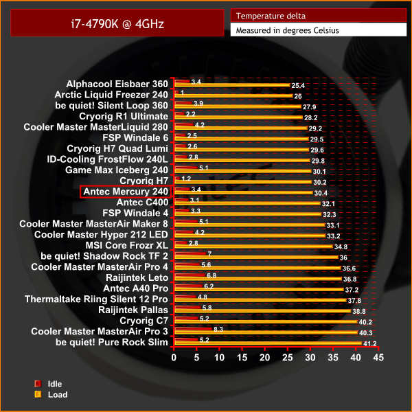We have since received a new sample from Antec, as they thought we had been sent a pre-production sample that was not indicative of the cooler's true performance. Having tested this new Mercury 240, there is some merit to what Antec said – the CPU came in around 1.5C cooler when overclocked, and 0.5C cooler when running at stock. This is not a huge difference, but it is certainly better than before.