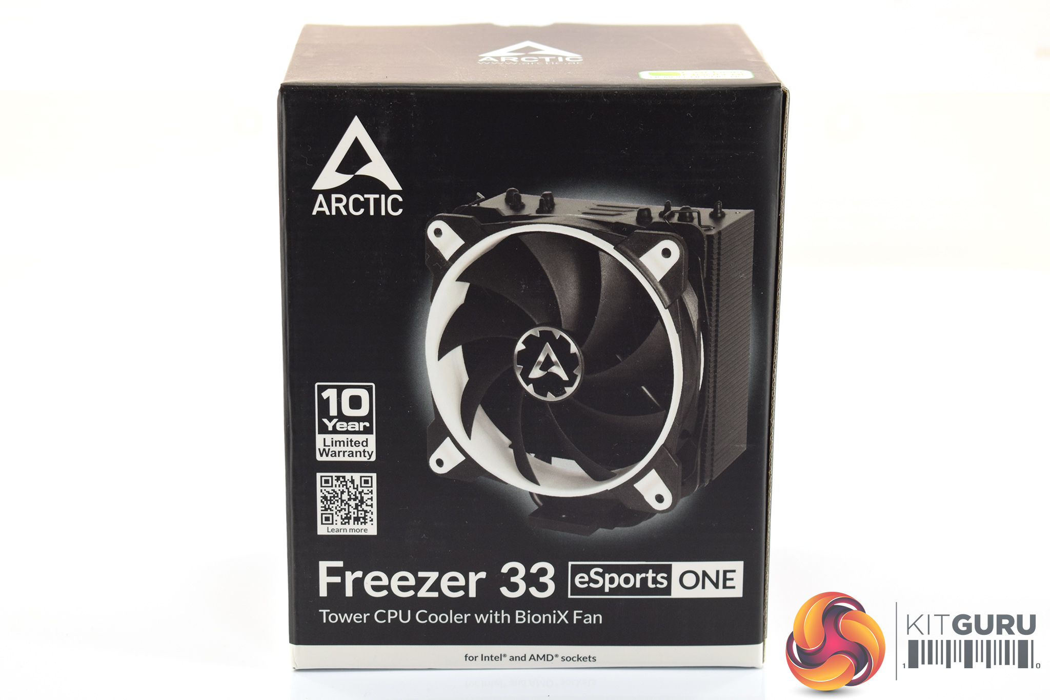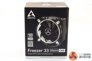 The Arctic Freezer 33 eSports One cooler ships in a black box with white accents. A large photo of the cooler itself is visible on the front of the box.