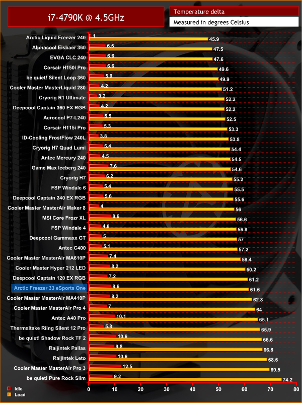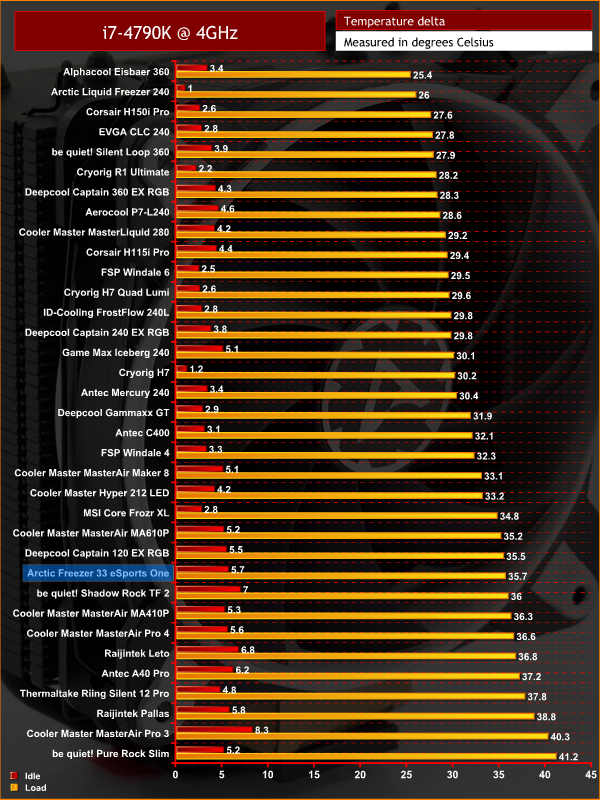 As you can see, thermal performance of the Freezer 33 eSports One is towards the lower end of the spectrum – be it at stock clocks or when cooling an overclocked CPU. Initially this may not look too good for Arctic, but when we factor in the price – just £29.99 – the relative performance is actually pretty good.