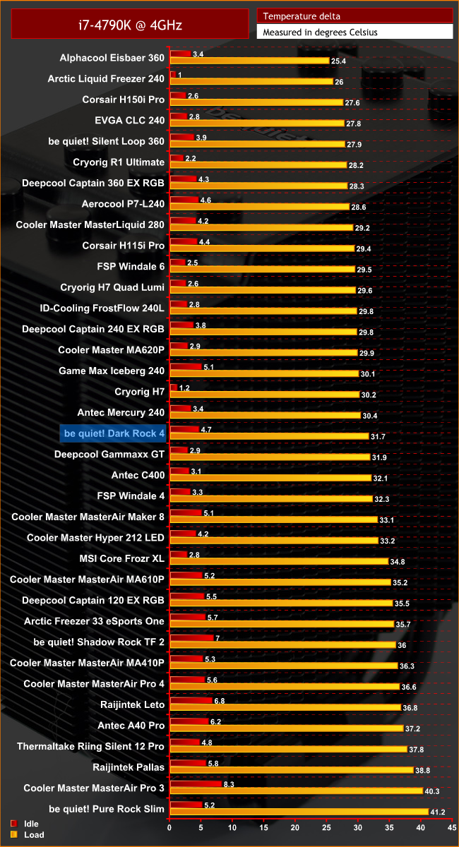 Getting right to it, you'd be forgiven for thinking the Dark Rock 4 is a rather average cooler – it does, after all, land right in the middle of our performance charts. However, most of the top entries on both charts are actually liquid coolers, and that means the Dark Rock 4 is one of the better-performing air coolers to come through our labs.