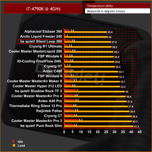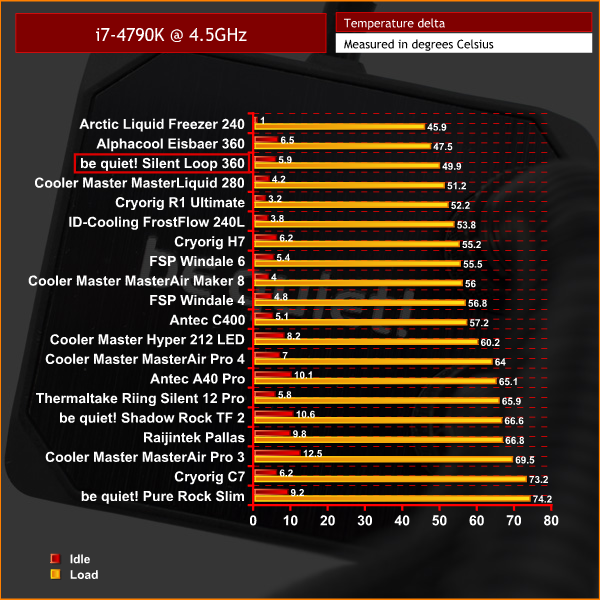 As we would expect from a cooler of this size, the Silent Loop 360 performs very well. It is just a couple degrees behind the Alphacool Eisbaer 360 across both tests, something likely down to the two products having different pumps and radiator fans. Still, being the 3rd most effective cooler we've tested to-date is not a bad achievement at all.