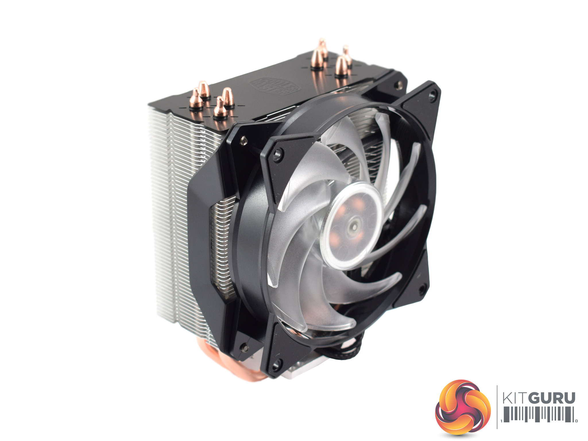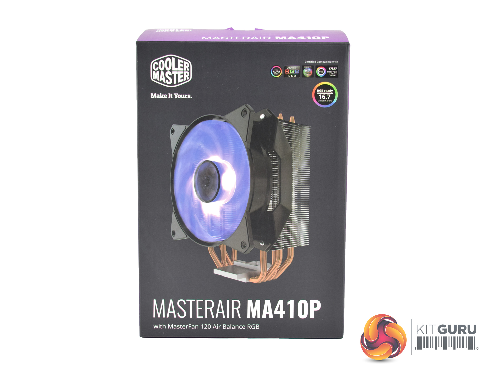 The Cooler Master MasterAir MA410P ships in a dark box that features a large product photo on the front – RGB fan in full view.