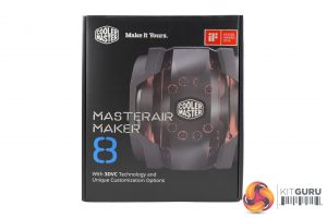 The Cooler Master MasterAir Maker 8 ships in a black box, while a top-down photo of the cooler itself is visible from the front.