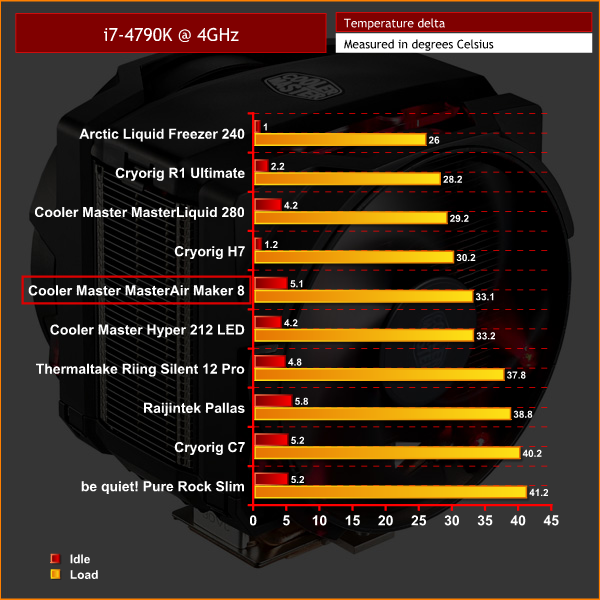 Thermal performance is slightly disappointing. With our CPU at stock-clocks, the similarly-sized Cryorig R1 Ultimate is able to beat the Maker 8 by 4.9 degrees Celsius. Things do look better once we apply an overclock to the CPU, but even then, the cheaper Cryorig R1 Ultimate still performs 3.8 degrees better.