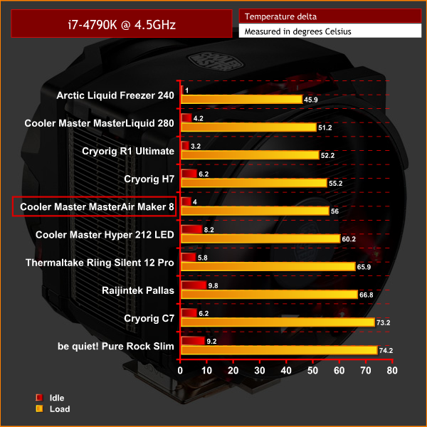 Raw performance figures do not tell the whole story, though, as good acoustics is a big part of what makes a successful cooler. In my experience, the Maker 8 is an incredibly quiet cooling solution – with our test system idling, the cooler is dead silent, and the fans look like they are barely spinning.