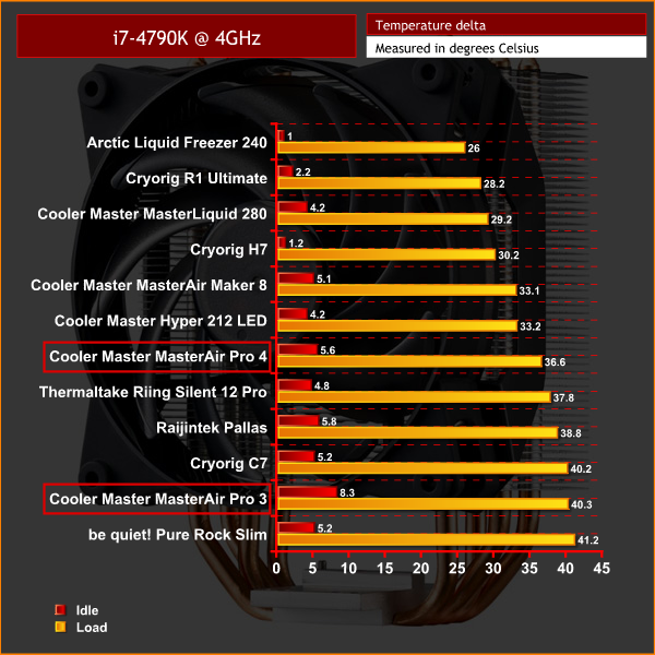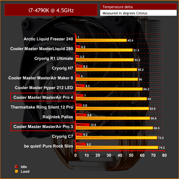 I must confess to being slightly disappointed with the performance of both coolers here. The Hyper 212 LED beats out the Pro 4 by a significant margin, while the Pro 3 is bested by a low-profile cooler in the shape of the Raijintek Pallas.
