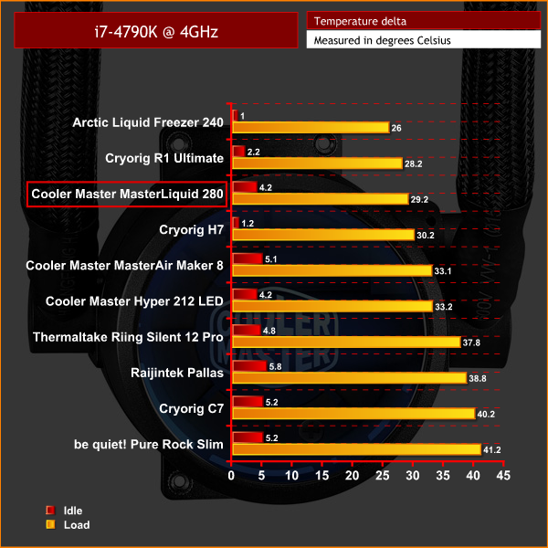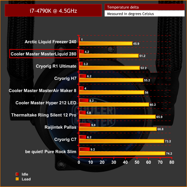 The MasterLiquid Pro 280 is a decent performer when dealing with both a stock-clocked and overclocked CPU. However, it is unable to dethrone the Liquid Freezer 240 which remains king of our cooling charts.