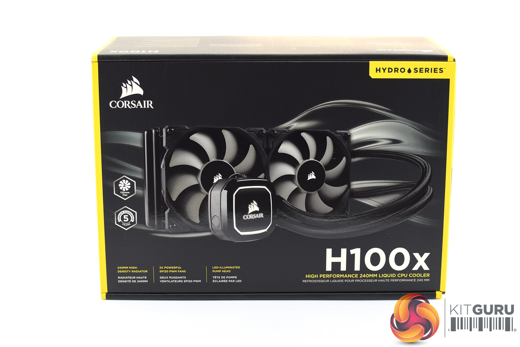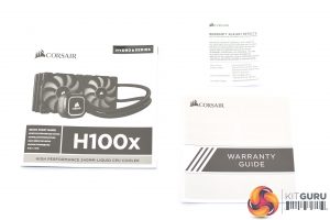 Just like any other Corsair product released over the last few years, the H100x ships in a black box with yellow accents. A large image of the cooler itself is visible from the front.