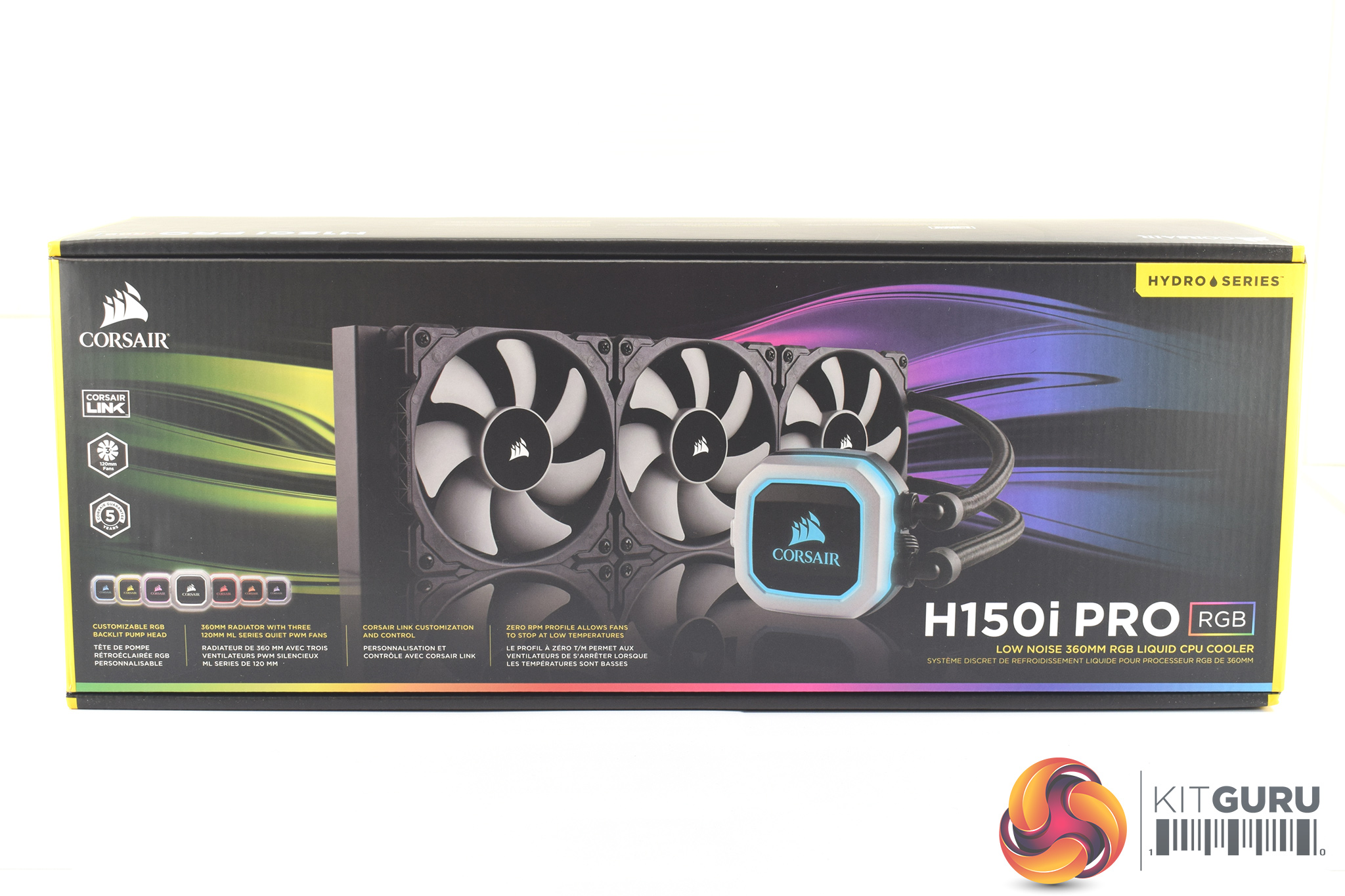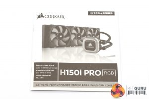The Corsair H150i Pro ships in a black box with some bright, colourful accents on the front which obviously ties in with the RGB nature of the cooler.