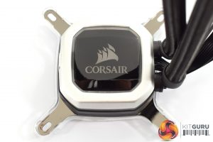 Corsair has also made some aesthetic modifications to the pump/waterblock: the central section is glossy plastic, surrounded by a white ring made of aluminium. The Corsair logo is obviously illuminated by RGB LEDs, something we look at later in the review.