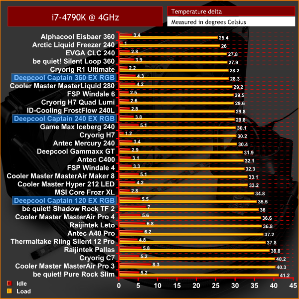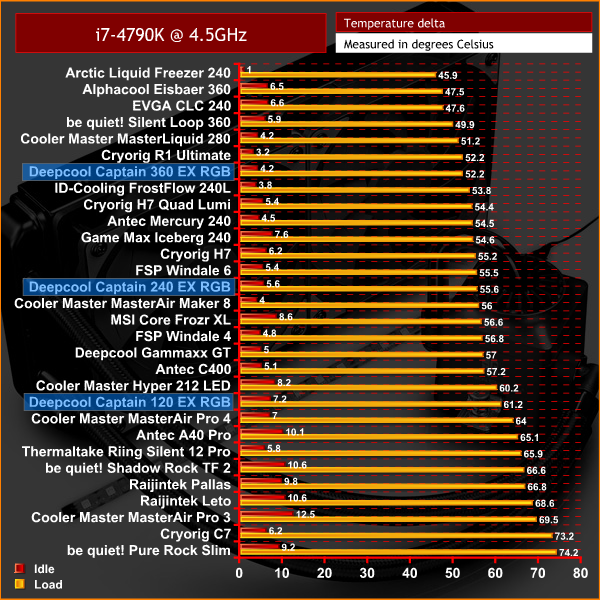I must admit, overall performance of the three Captain EX RGB coolers is a bit disappointing. The 240 EX RGB is very average at stock clocks, but with an overclocked CPU it recorded the highest delta temperature of any 240mm liquid cooler we have tested.