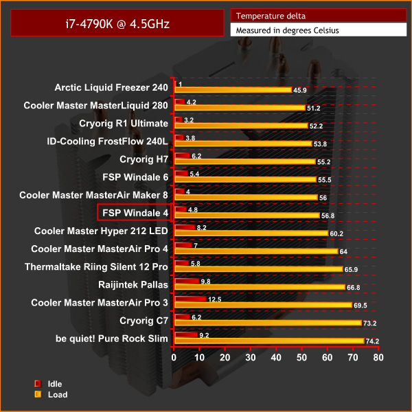 Considering both the Windale 4 and Windale 6 use the same fan (though the Windale 4 unit does not have the integrated LEDs) it is not a surprise that both emit similar noise levels. This means the Windale 4 is generally pretty quiet, and is certainly inaudible at idle. It does ramp up when the system comes under heavy load, but the fan is still relatively innocuous thanks to its 1600 rpm max speed.