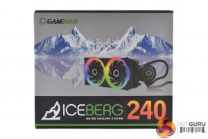 The Game Max Iceberg 240 ships in a colourful box, with a photo of the cooler set against a mountainous backdrop visible from the front.