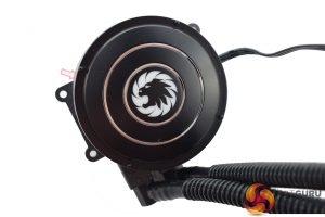 Lastly, the pump/waterblock sports the Game Max logo in a very central position, and this logo is also illuminated by green-only LEDs.