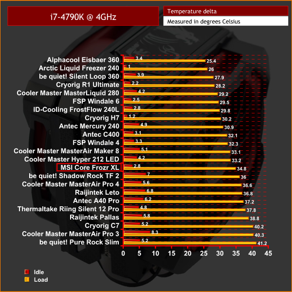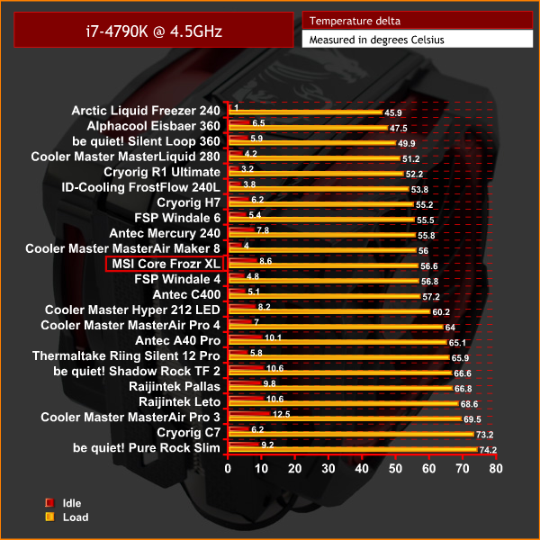 As you can see above, performance of the Frozr XL is actually quite middling. It does perform a bit better with an overclocked CPU, but even so, I would've thought that its 8 heatpipes, and two fans, might have helped temperatures a bit more.