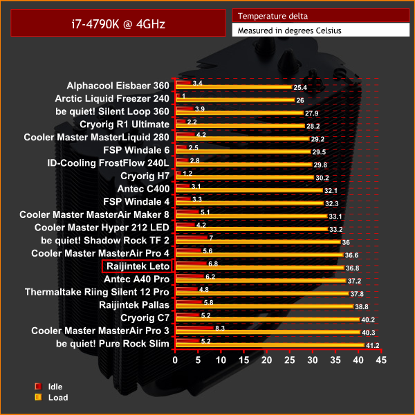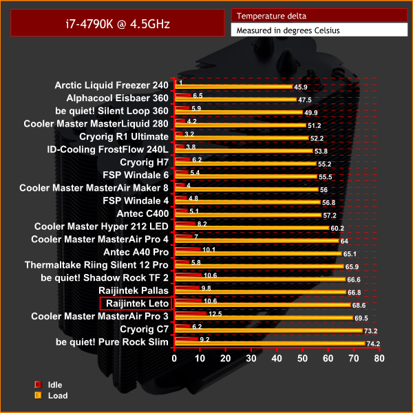 As you can see, the Leto's relative performance is best when tested with the CPU at stock clocks. Here it performed almost identically to the bigger Cooler Master MasterAir Pro 4, despite that cooler having an extra heatpipe as well. For the money, the Leto's stock-clocked performance is quite impressive.