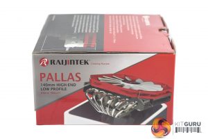 The Raijintek Pallas ships in a relatively small, red box. On the front side, we get a look at the cooler itself, with the red fan being particularly visible.