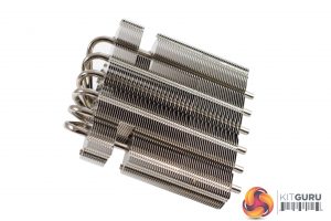 Made entirely of nickel, but with a copper base, the heatsink is comparatively very small but it still manages to cram in 6 copper heatpipes, each with a 6mm diameter. Hopefully this should aid cooling performance, something we look at later in the review.