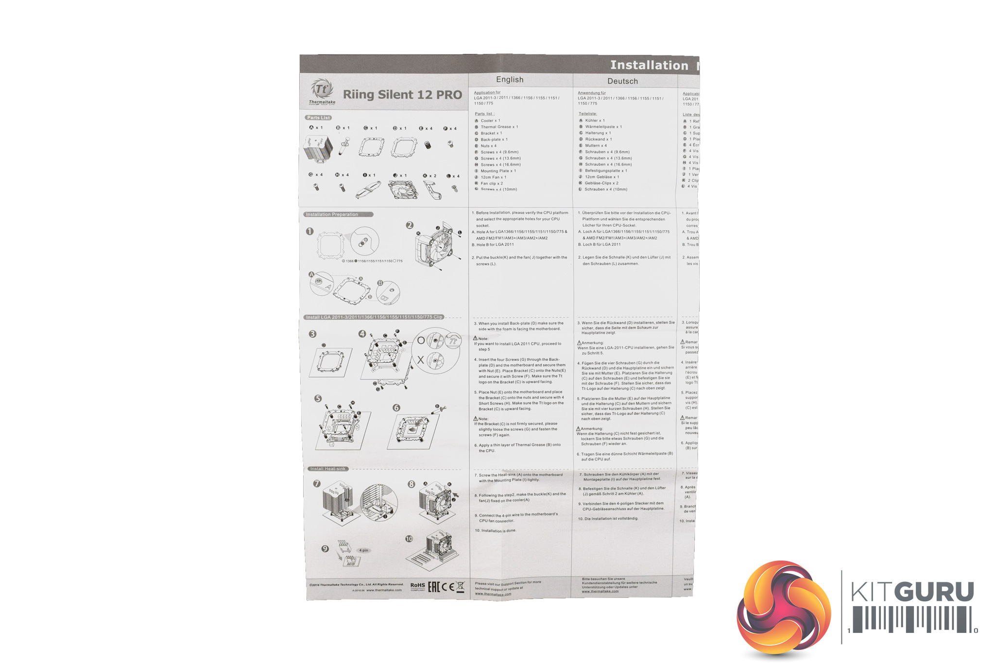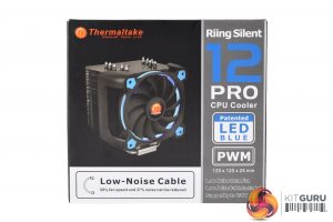 The ThermalTake Riing Silent 12 Pro ships in a medium-sized box, while there is a photo of the cooler itself visible from the front.