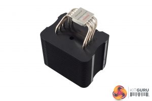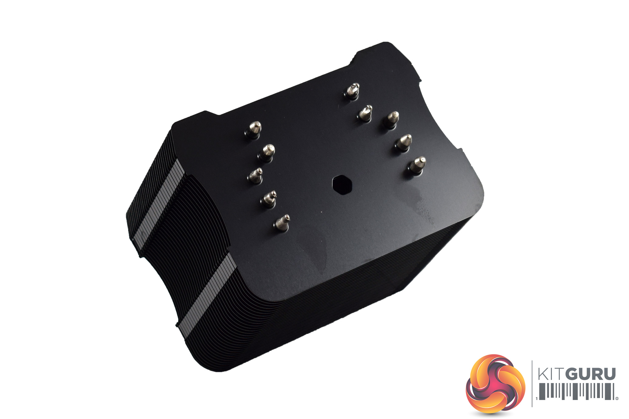 Lastly, the heatsink is a jet-black slab of metal, complete with 5 copper heatsinks. Incidentally, these heatpipes, along with the CPU block, are nickel-plated, and I think the chrome/nickel look contrasts very nicely against the black heatsink.