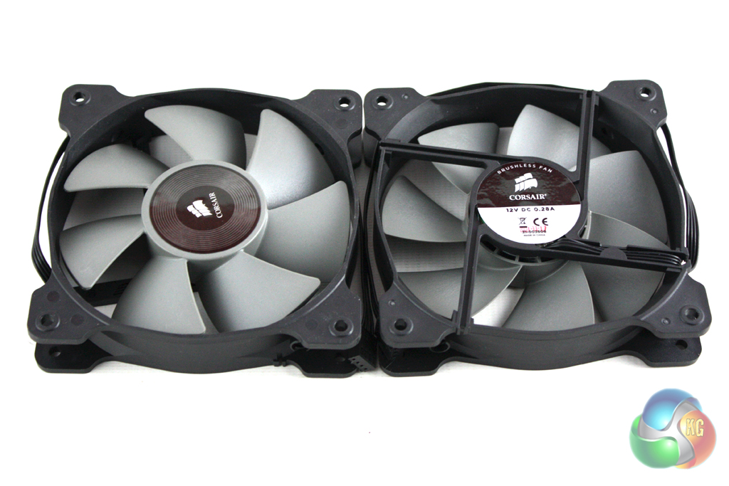 Corsair include two SP120L fans with the cooler which are very good quality. They are very similar to the SP120 fans which Corsair sell separately, albeit slightly cheaper versions with added PWM functionality. These are 120mm models which spin up to 2,435 RPM.