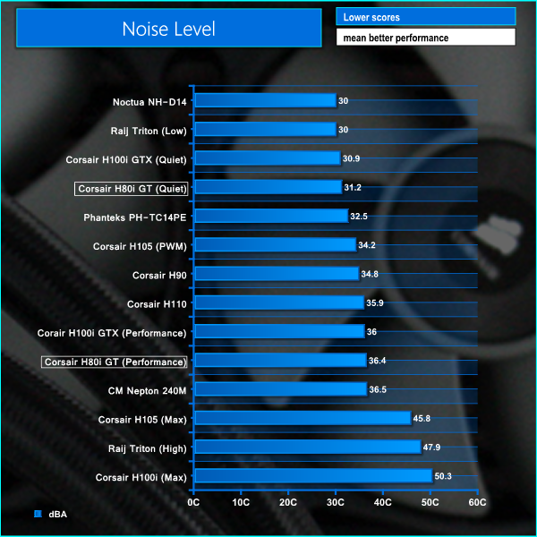 The H80i GT is very quiet in operation when set up correctly. With the unit running in performance mode, the unit gets significantly louder, though.