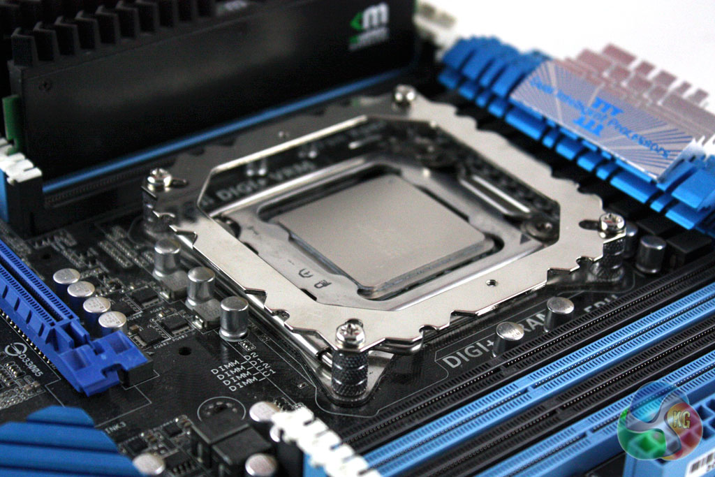 First of all we must install the retention bracket to our motherboard. This requires us to place four standoffs over the screw threads in each corner of the socket, place the bracket on top and secure into place using the four provided screws.