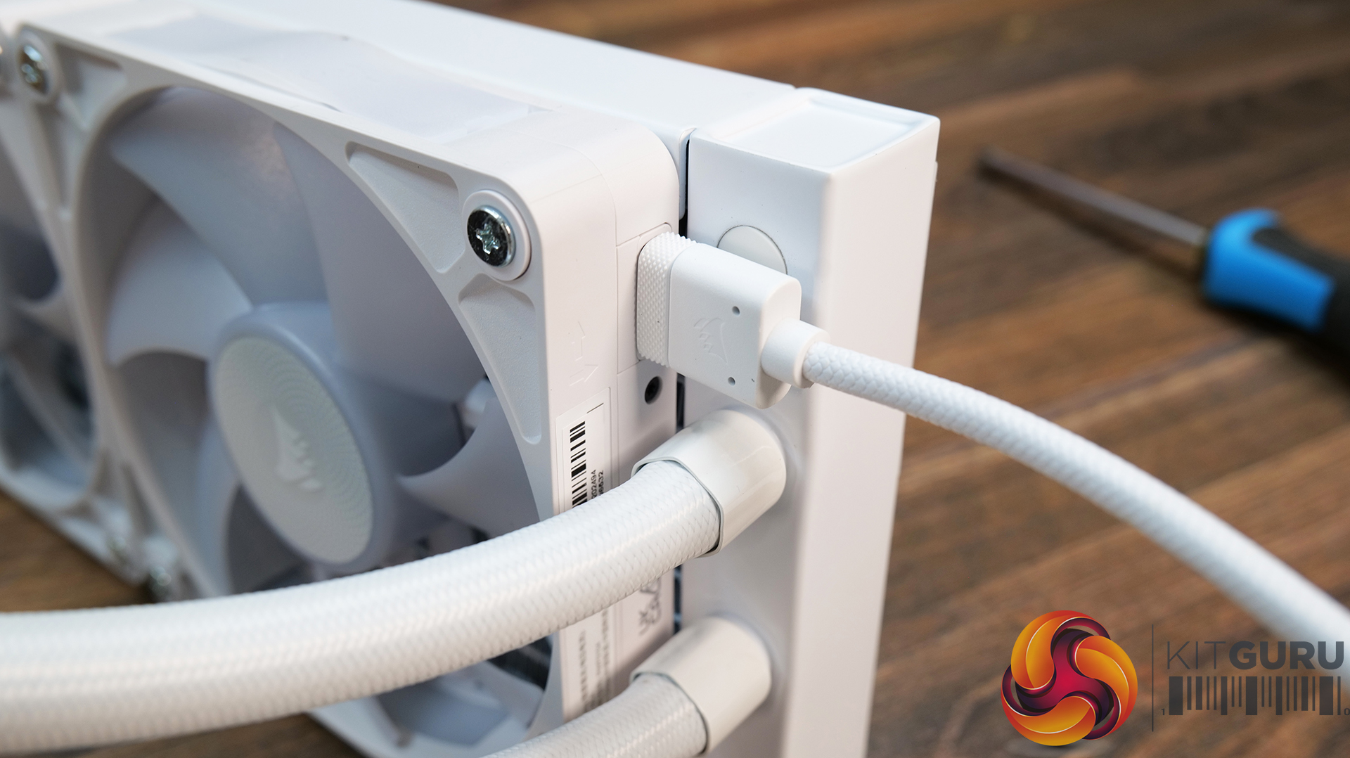 There are a couple of different types of iCUE Link cables supplied with the cooler, choose which type you prefer to connect to the CPU block. We found the angled one to be the best fit and also the best visually. Connect the other end of the cable either directly to the iCUE Link hub or to the iCUE Link connector on the fans, either way is fine, just choose whatever works best for your installation.