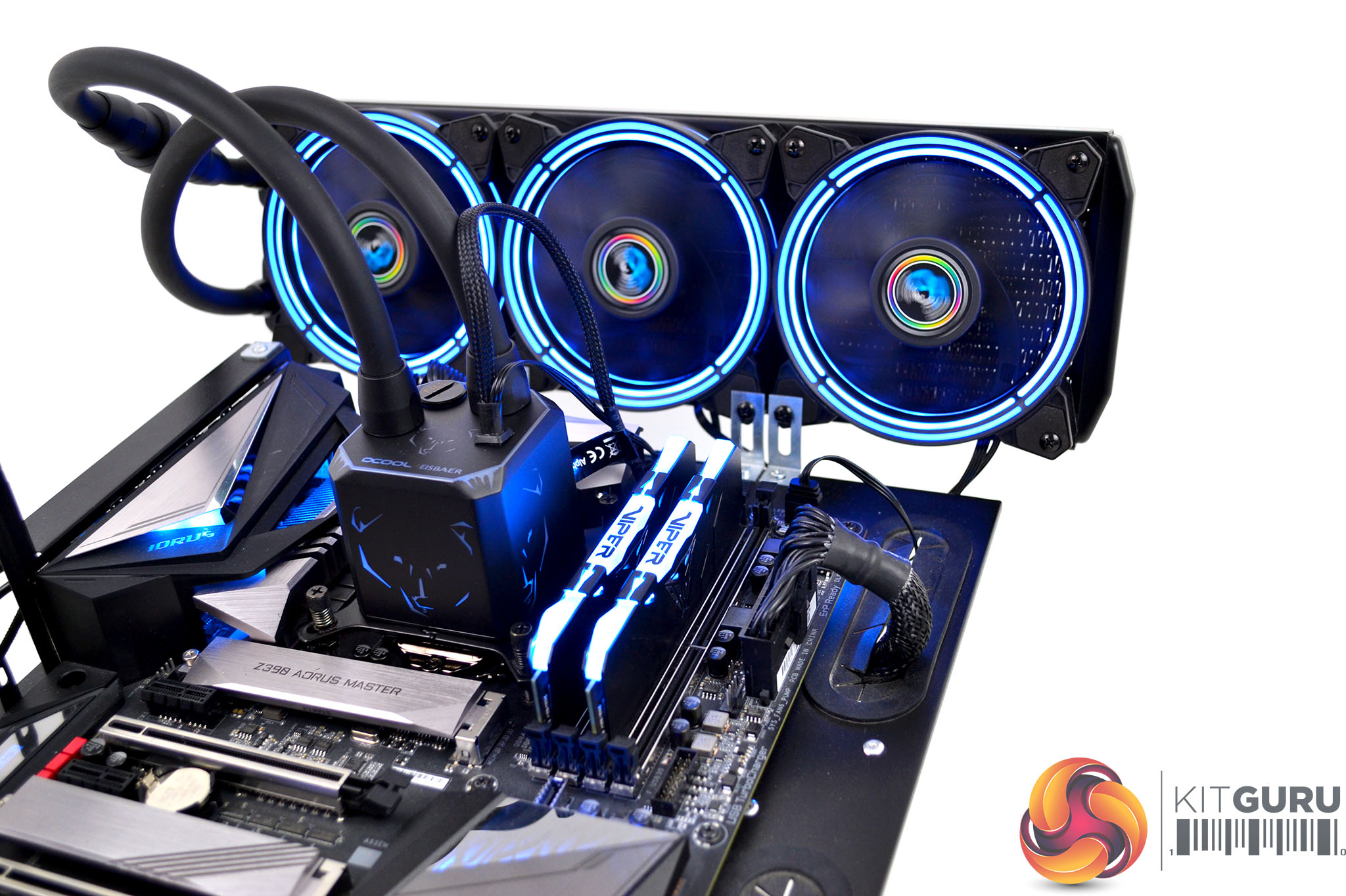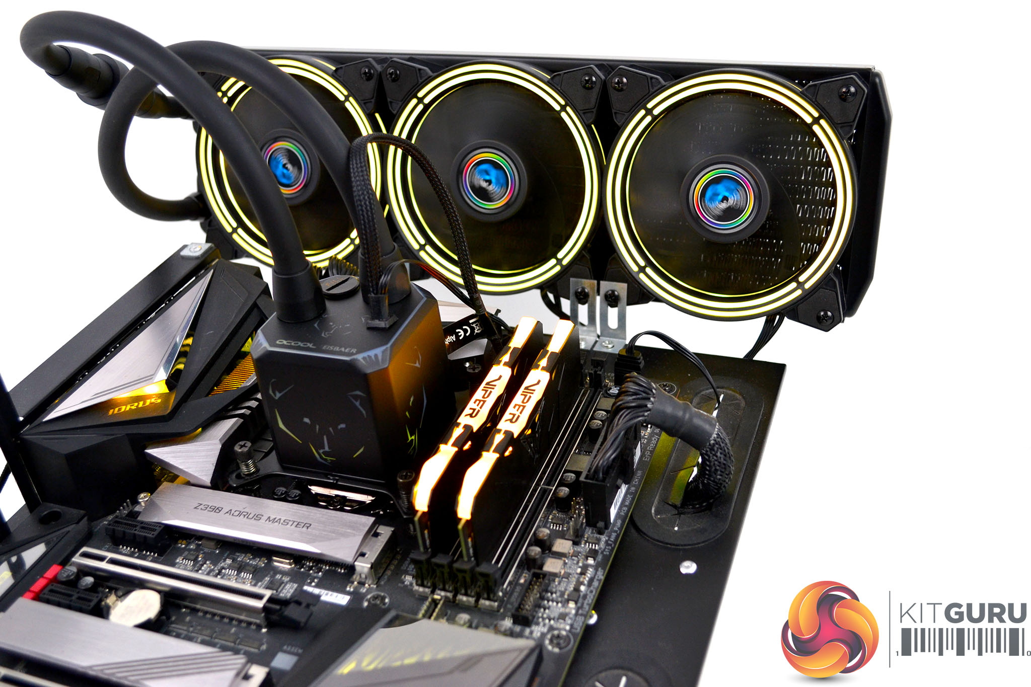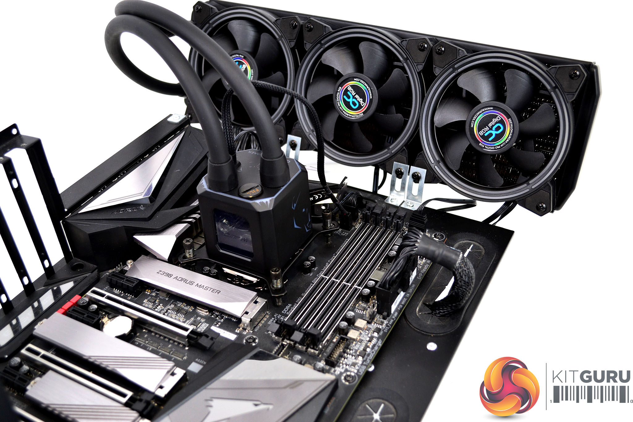 There are two ways to connect the RGB lighting of the Alphacool Eisbaer Aurora. Since our Gigabyte Z390 Aorus Master motherboard is equipped with ARGB lighting headers, we will use this option. Connect the 3-pin RGB cables of all the fans and the CPU block together and using the Alphacool 3-pin ARGB extension cable, connect it to the motherboard 3-pin RGB header. Alternatively, you can connect the 3-pin ARGB cable to the Alphacool RGB controller for standalone RGB control.