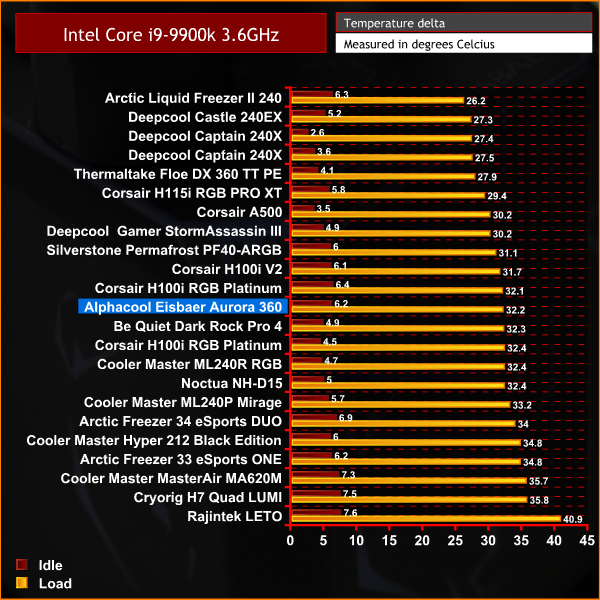 With the Intel Core i9-9900K configured at 3.6Ghz core frequency, the Alphacool Eisbaer Aurora recorded 32.2°C average delta CPU temperature under load, which is a little below the thermal performance what we would expect from an all-in-one liquid cooler of its size.