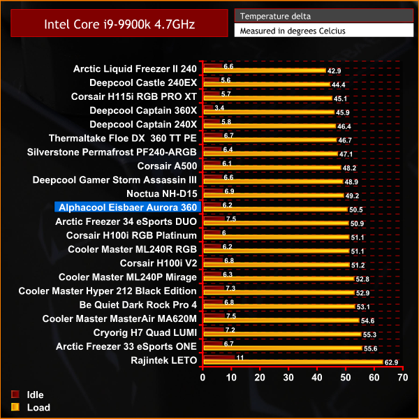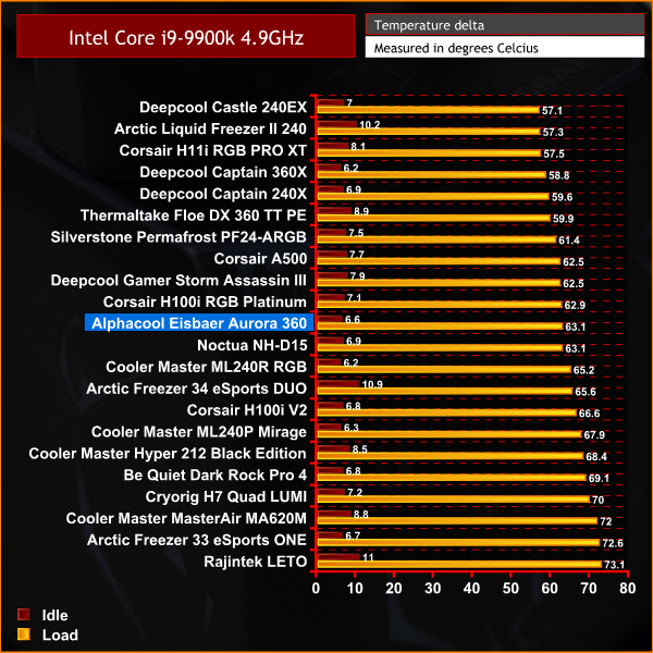 It's much of the same story with the Intel Core i9-9900K core frequency at 4.9GHz. In our extreme overclocked frequency test, the Alphacool Eisbaer Aurora 360's thermal performance is slightly disappointing as it is beaten by cheaper air coolers and many other AIO coolers that we have tested over the past year.