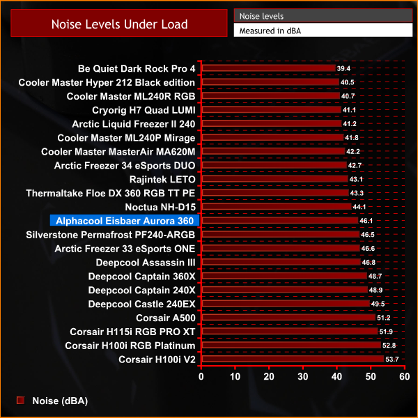 Maximum speed of the Eisbear Aurora fans is relatively high at 1800RPM. However, noise levels are more than tolerable, we recorded a maximum 46.1dbA noise with the fans running at full speed, which is considerably lower than some other all-in-one coolers we have had on our test bench in the past.
