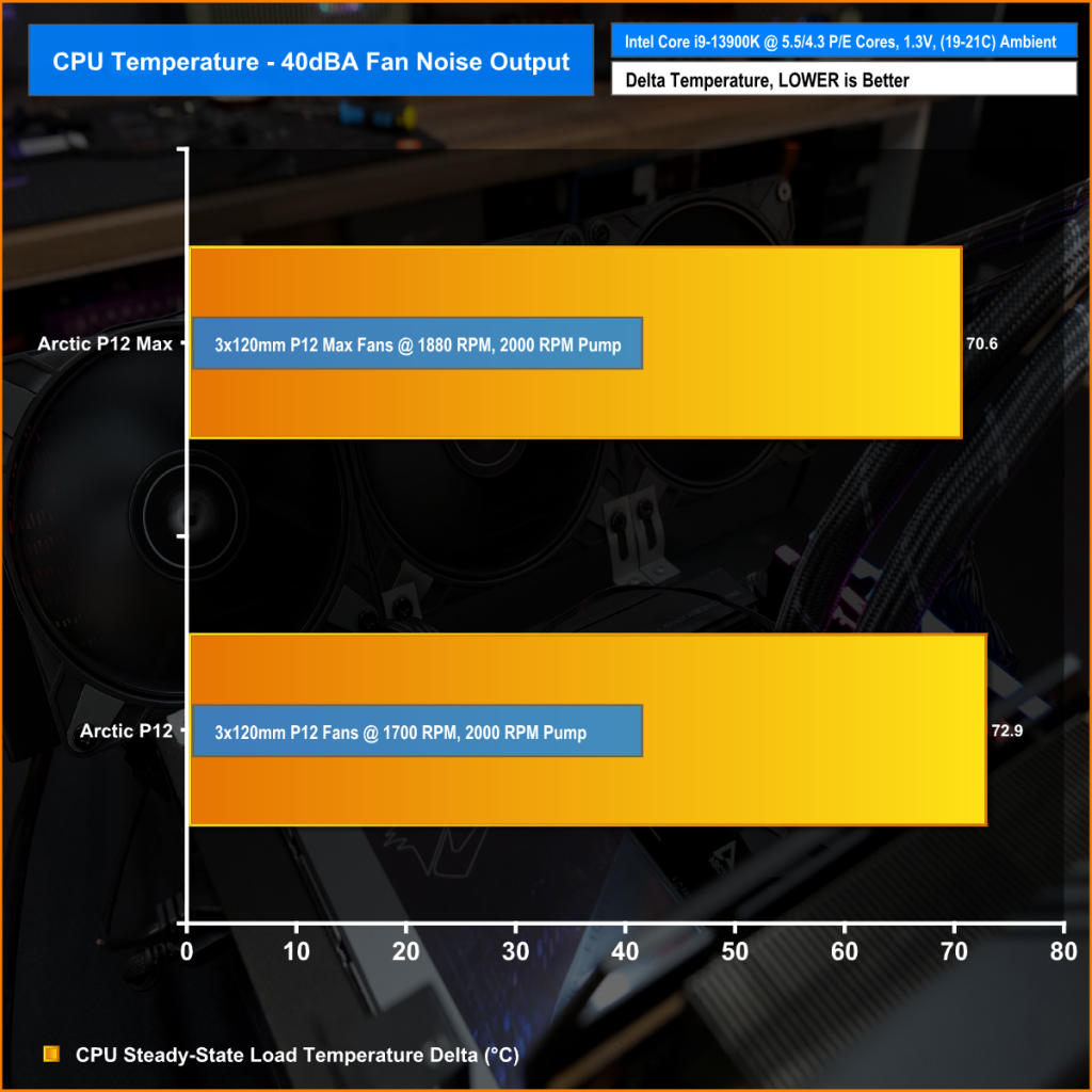 But with the fans limited to 40dBA noise output the P12 Max again offers an advantage in thermal performance over the P12, as the P12 Max fans are able to run at higher RPM. The difference in temperature Delta between the two at 40dBA may only be small but any decrease in CPU temperature is seen as a positive.
