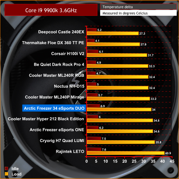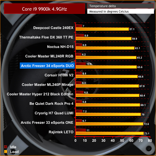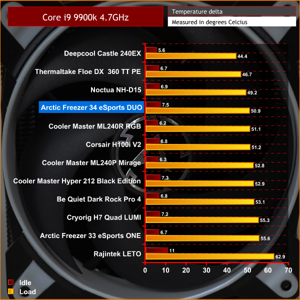 Even more impressively in our initial 4.7GHz overclock test, the Freezer 34 performs even better, leapfrogging two more 240mm AIO coolers with a load temperature of just under 51°C Delta and way above its closest rival the Cooler Master Hyper 212.