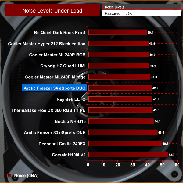 In our noise levels test with fans at 100% speed, the Freezer 34 measures a respectable 42.7dBA which puts it mid-table in our charts. It was noticeable during testing, when the fans are in there PWM low speed mode, they are virtually silent. Considering how well the Freezer performed in thermal testing, this is quite an achievement.