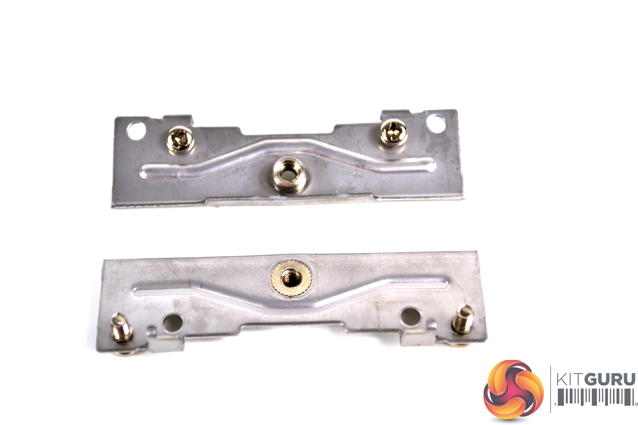 Now we can prepare the motherboard by fitting the two metal mounting brackets to the CPU socket. Positioning of the screw holes is different between the two brackets, so it is impossible to get them mixed up. Simply place them in the correct orientation and tighten in place using a Philips screwdriver.
