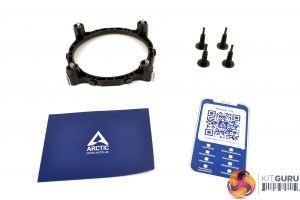 Inside the packaging is another smaller brown cardboard box as well as the cooler itself. The contents of the internal box include the Intel mounting bracket, four clips to hold the bracket in place, along with an Arctic compliments card and a QR code with a link to the installation guide.