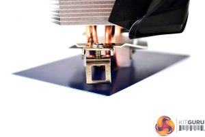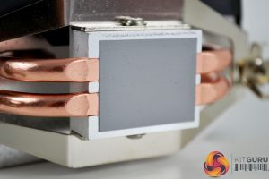 With the thermal compound coating removed, we can see that the two heat pipes run across the centre of the base plate, they have a smooth machined finished and are mounted in a pretty crude looking, but functional aluminium block.