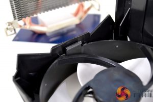 The P-series fan also arrives pre-installed to the cooler and is housed inside a shroud that is designed to direct airflow at the heatsink. The fan, along with its shroud can be removed from the heatsink and is held in position by two clips. This makes it easy to remove but also means that is could be difficult to use the cooler with a different fan if required.