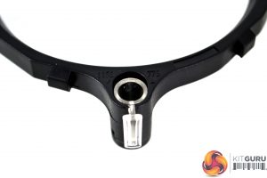 Push down on the bracket so that it clicks into position in the holes and then take the four black plastic clips and insert them into the mounting holes to lock the bracket in place.