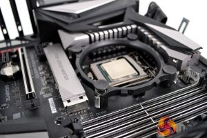The next part of the installation process threw up an issue for us, due to the large thermal solutions of our test system's Gigabyte Z390 Aorus Master motherboard, the Freezer 7 X mounting bracket interfered with the VRM and M.2 socket heatsinks. This is no real surprise since this cooler is technically not suited to these high-end platforms after all.