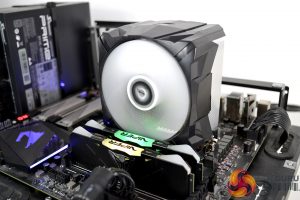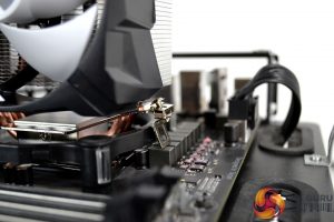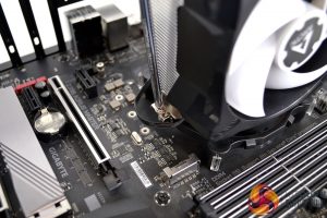 To overcome this issue, we removed the M.2 heat spreader and the VRM heatsink to complete the installation process. We were then able to lower the cooler down in position, locate the mounting hooks and screw it in position. Arctic clearly states on its website that there are compatibility issues with some motherboards and requests users to contact them for a solution. If users do encounter compatibility issues after purchase, Arctic will offer an alternative replacement cooler.
