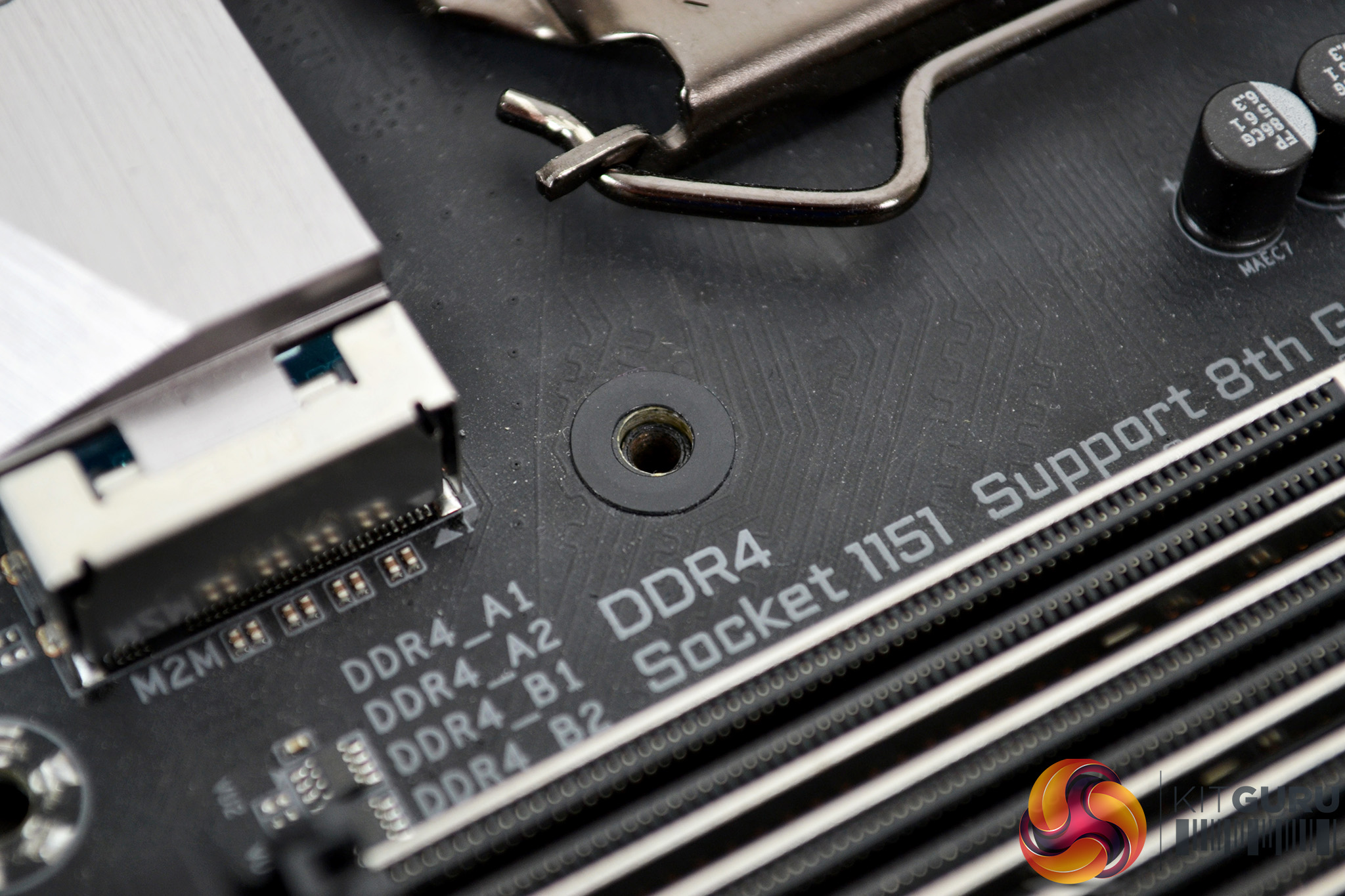 Next, flip the motherboard back over while holding the cooler’s bracket in place. Notice the bracket threads are below the motherboard surface and still lined up with the holes. To protect the motherboard, attach the self-adhesive washers over the fixing holes.